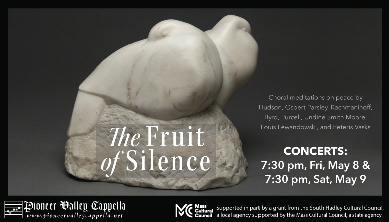 Pioneer Valley Cappella, Geoff Hudson, conductor, presents "The Fruit of Silence," choral meditations on peace. Concerts will take place in Northampton and South Hadley, 7:30 pm, Friday, May 8 and Saturday, May 9. Rehearsals are Thursdays 7:30-9:30 pm at the Northampton Community Music Center. We will audition all voice parts in January.